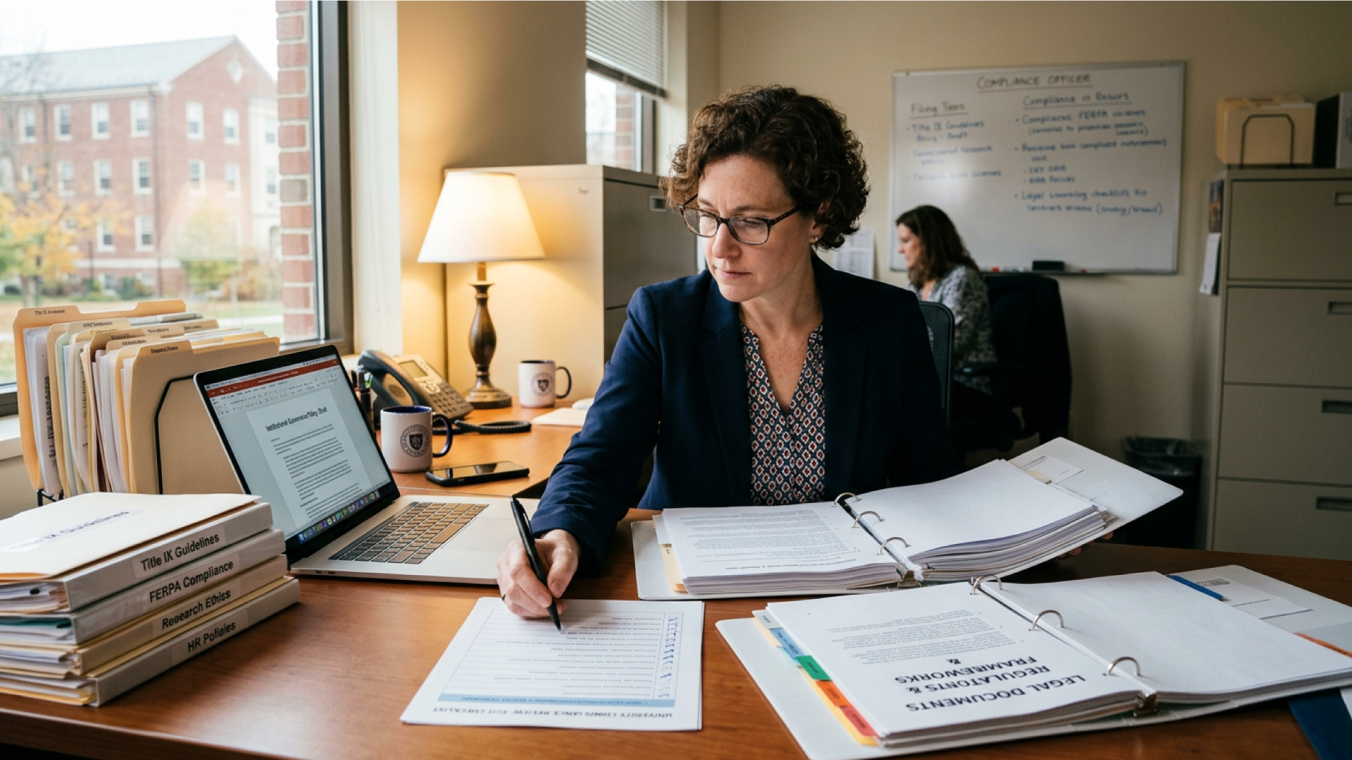 A compliance officer reviewing institutional frameworks and legal documents to ensure university standards are met.