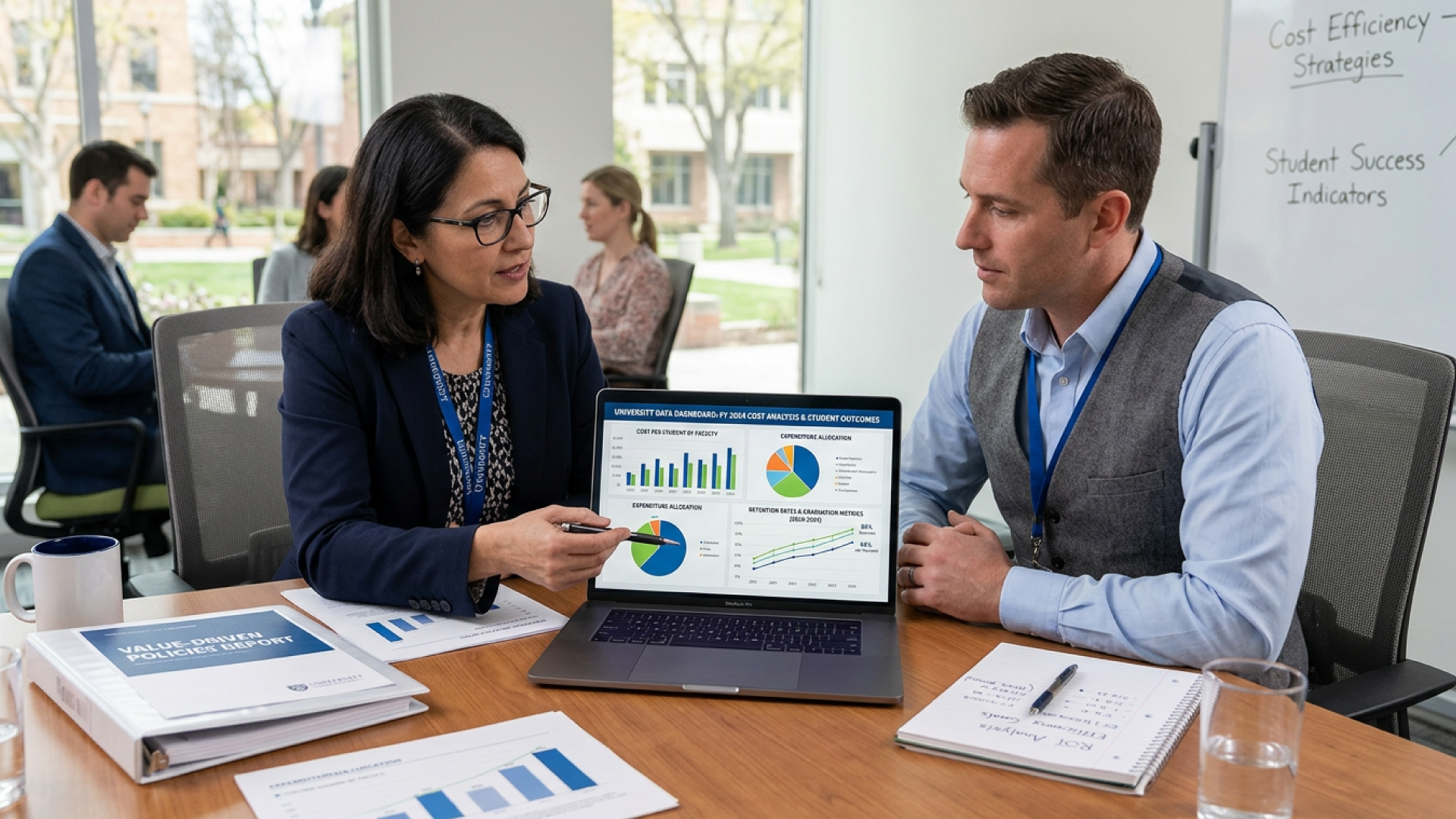 A university administrator presenting a cost-analysis dashboard to ensure tuition fees are driving positive student success indicators.